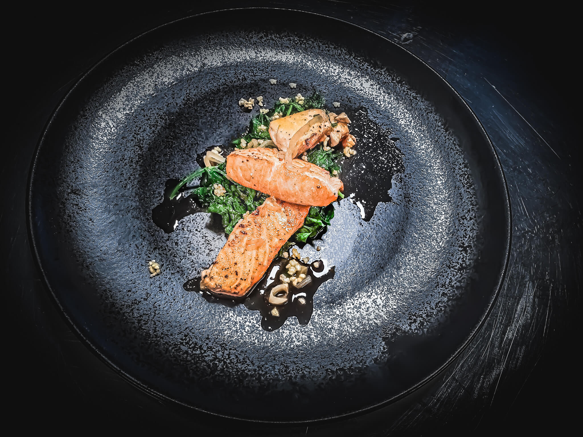 - Lachs portionieren, mit Zitronenöl beträufeln und mit Salz & Pfeffer würzen.